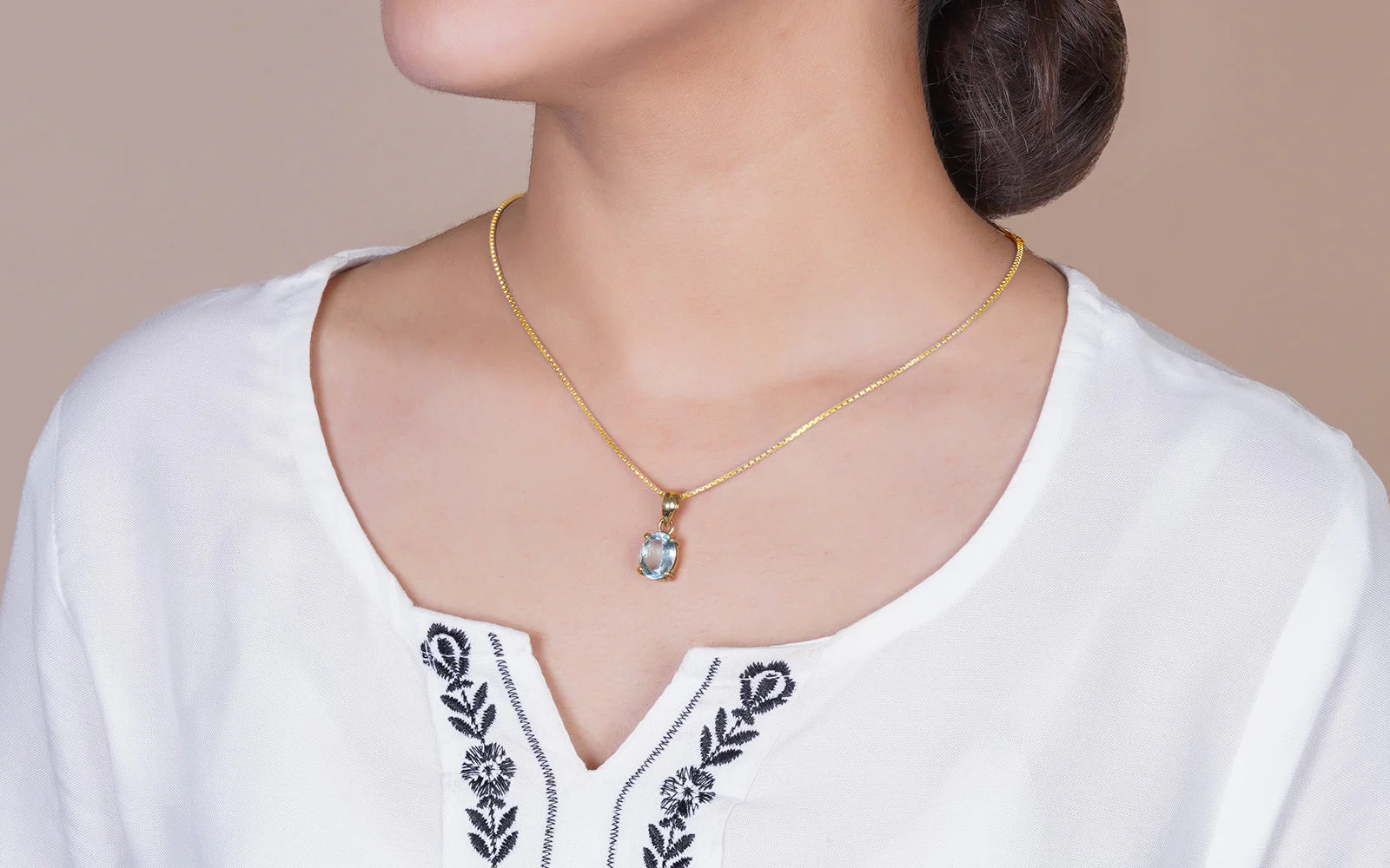 Natural Aquamarine shines with a soft blue color that reflects the calmness of the sea. Linked to the planet Neptune, it is believed to bring peace, courage, and clear communication. This 4.67-carat pendant features an oval/mixed shape with a skillful faceted cut that adds sparkle. The Aquamarine comes with certification confirming its natural origin and purity.